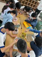 ボランティアさんと6年生が、学校園で収穫した「ごま」の選別作業をしています。